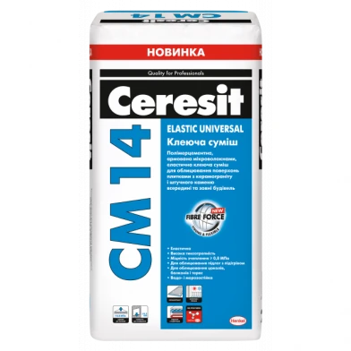 CERESIT® CM 14 — сухая смесь для облицовки бетонных, кирпичных, цементно-песчаных, цементно-известковых и т.п. минерал. горизонт. и вертикал. поверхностей разными плитками, в т.к. ч. из искусственного камня (размер ≤ 60×60 см, водопоглощение > 0%) внутри и снаружи зданий.