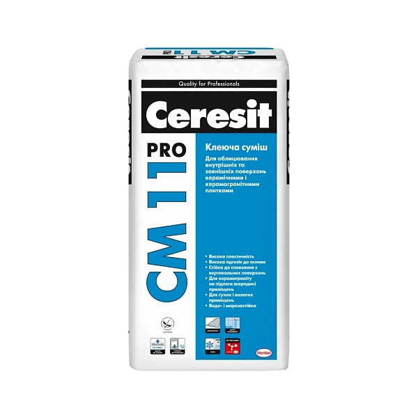 Ceresit CM 11 Pro – суха клеюча суміш для облицювання мінеральних горизонтальних і вертикальних поверхонь, що не деформуються. Призначена для укладання керамічної плитки розміром до 60×60 см з водопоглинанням ≥ 0,5% всередині та зовні будівель. Дозволяється укладання керамогранітної плитки такого ж формату на внутрішні підлоги.
