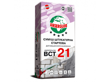 Суміш штукатурна стартова цементно-вапняна сіра ANSERGLOB ВСТ 21 призначена для машинного, а також ручного традиційного rdquo; нанесення штукатурного шару на міцних недеформованих основах з важкого бетону, шлаку. і керамзитобетону, пиляного каменю-черепашника, керамічної та силікатної цегли, а також пористих бетонів (пінобетон, газобетон, газосилікат і т.д.).