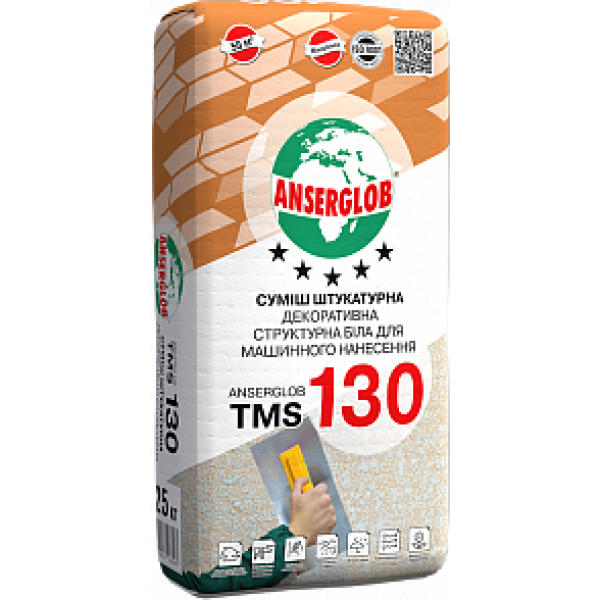 Мінеральна штукатурна суміш для машинного нанесення з високим ступенем білизни призначена для декоративного оштукатурювання поверхонь всередині і зовні будівель. Також застосовується як фінішне декоративне покриття в системі теплоізоляції Anserglob. Наноситься на будь які мінеральні основи (цементно-вапняні, цементно-піщані, гіпсові штукатурки, бетонні основи та ін). Призначена під подальше фарбування або застосовується в білому кольорі.