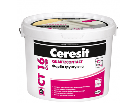 Краска грунтующая Ceresit CT 16 Супер предназначена для укрепления всех видов минеральных и органов местных поверхностей (бетон, кирпич, цементно-известковые или песчаные штукатурки, гипсокартон, ДВП, ДСП, OSB-поверхности, окрашенные водно-дисперсионными или алкидными красками). , а также для создания контактно-адгезионного слоя.