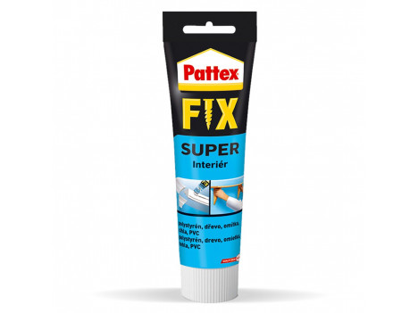 Pattex FIX SUPER – це універсальний акриловий монтажний клей без розчинників, для внутрішнього застосування, призначений для приклеювання матеріалів, що поглинають вологу, таких як елементи з жорсткого поліуретану, полістиролу, пінополістиролу (пінопласт), газобетон, пемза, гіпсокартон, гіпсові плити, матеріали з деревини (наприклад, ДСП), акустичні панелі та інші. Можна клеїти матеріали, які не поглинають вологу (пластик, кераміка, метал), але за умови, що інший матеріал до якого клеять поглинає вологу (цегла, бетон, штукатурка, дерево тощо). Не використовувати з тефлоном, поліетиленом, поліпропіленом.
