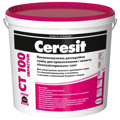 Суміш Ceresit CT 100 Impactum являє собою готовий до застосування матеріал, призначений для улаштування захисного шару в системах теплоізоляції Ceresit Ceretherm Impactum.